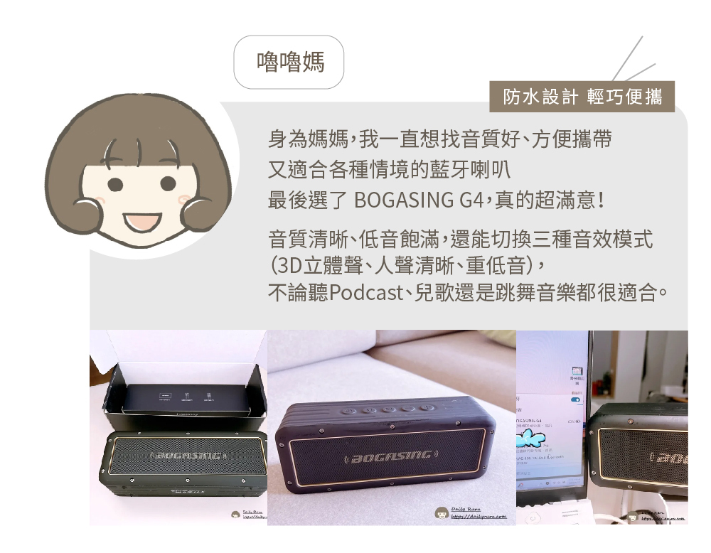 BOGASING G4 配備高品質音效驅動器,提供令人驚嘆的清晰聲音與強勁低音。其優秀的性價比,讓每一次播放都如置身現場,將您的聲音體驗推向新高度。